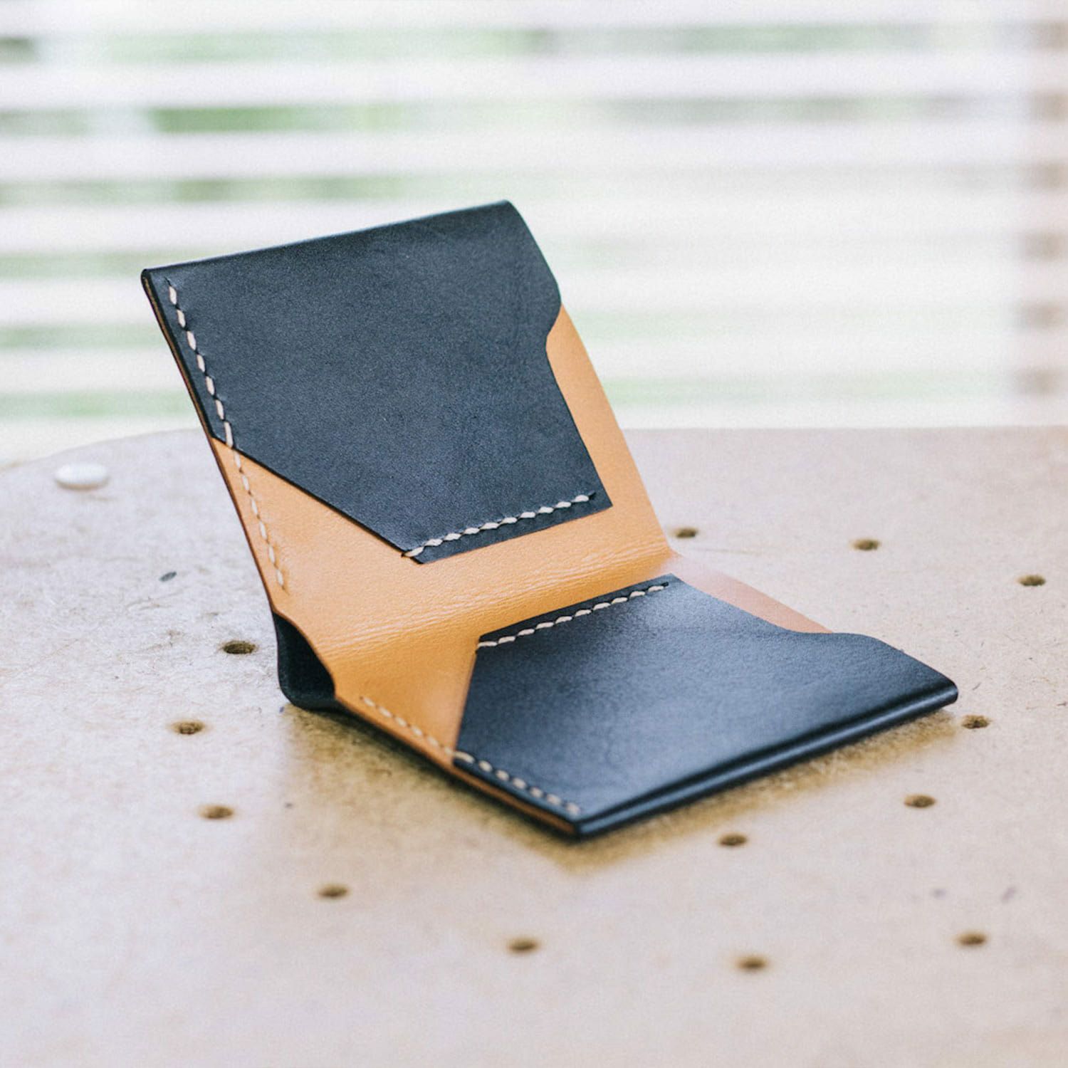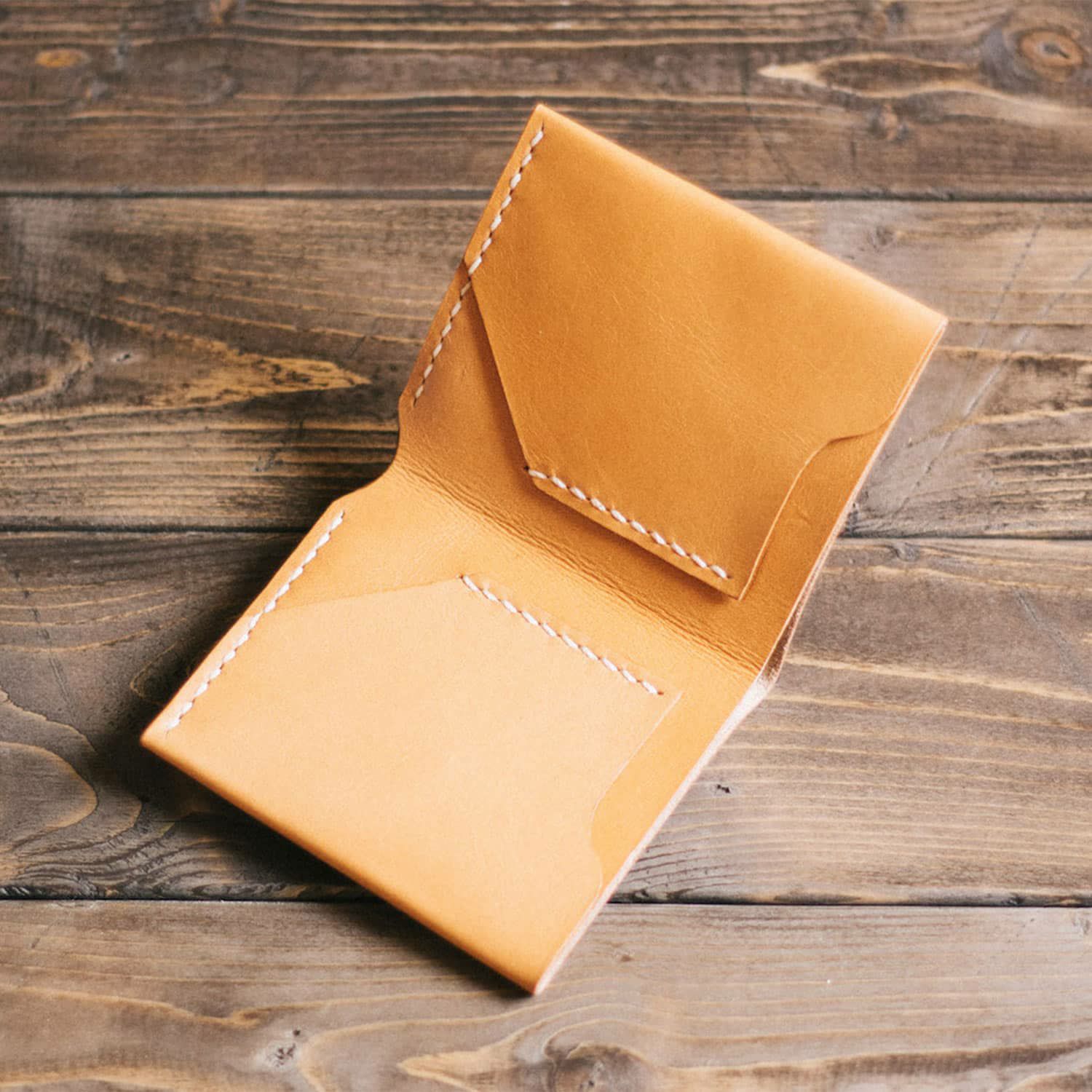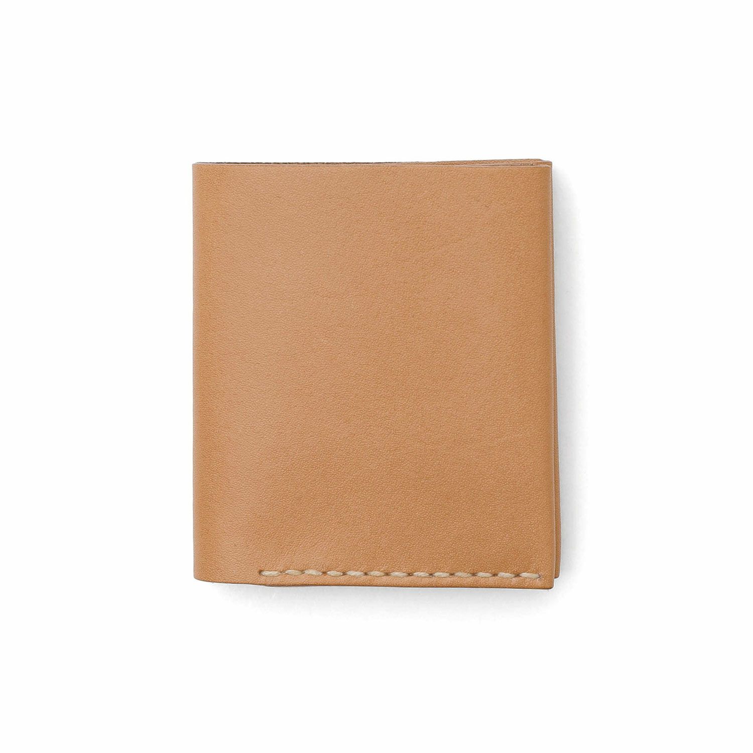 手縫いのステッチが印象的なシンプルなレザーの財布です。お札入れとカードポケットが2つのシンプルな仕様のため収納しても分厚くならず、ポケットの中でもかさ張りにくくなっています。革は植物性タンニン鞣しの革を使用しており、しっとりとした質感と発色のよさも特徴です。長く使い込むことで色艶が増していく革小物ならではの経年変化をお楽しみください。