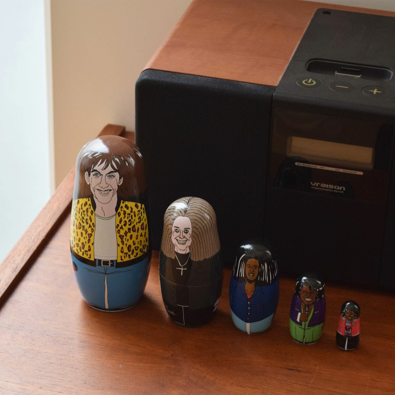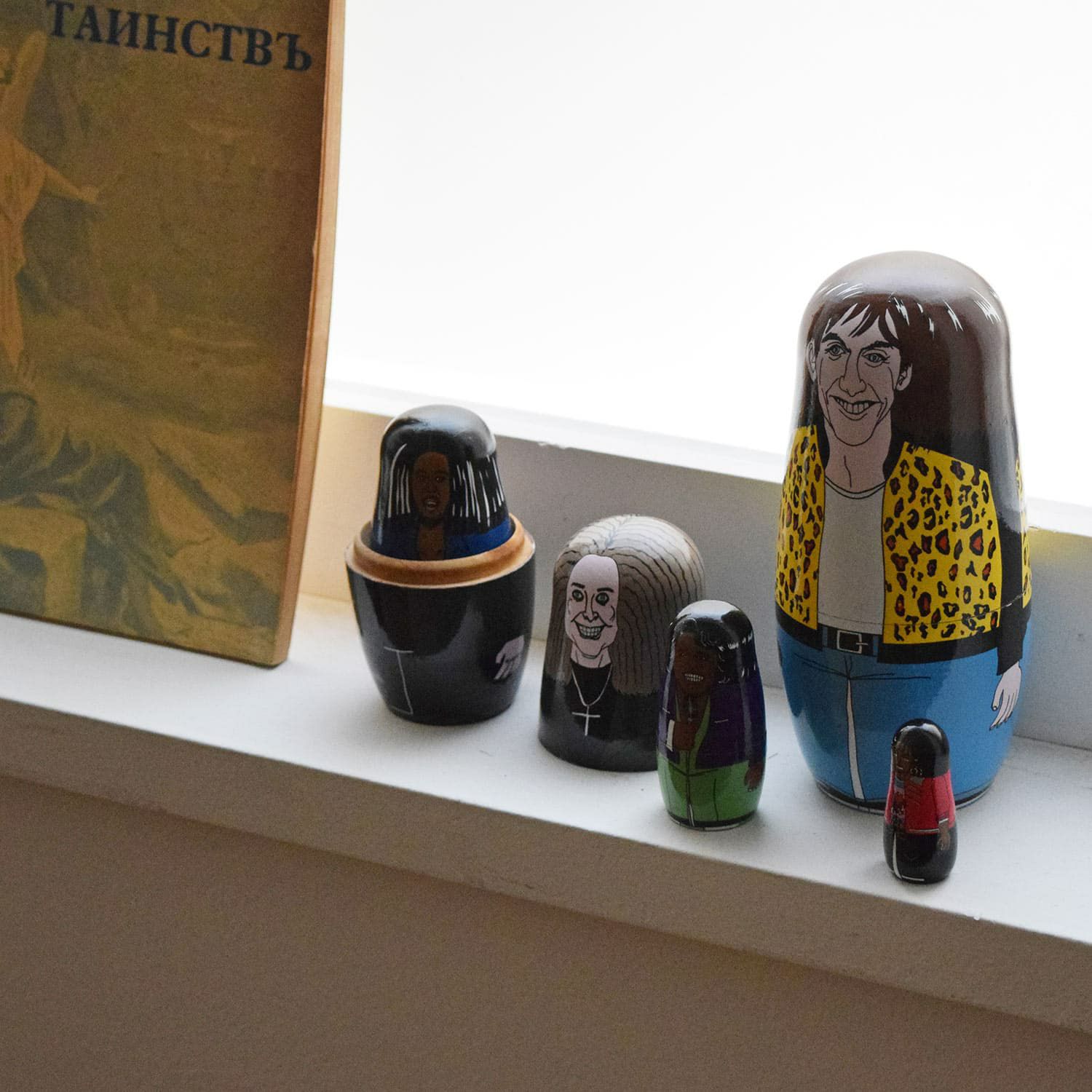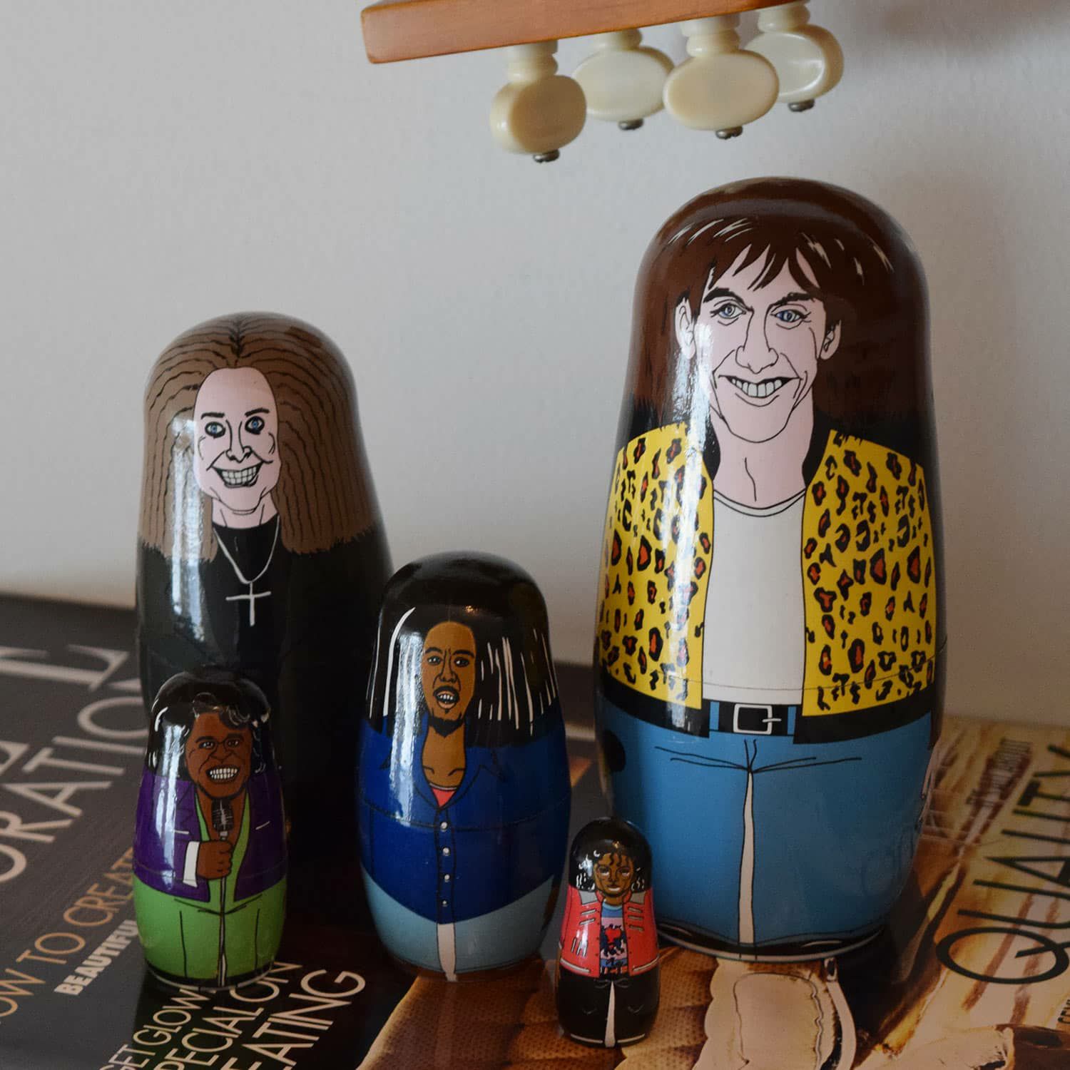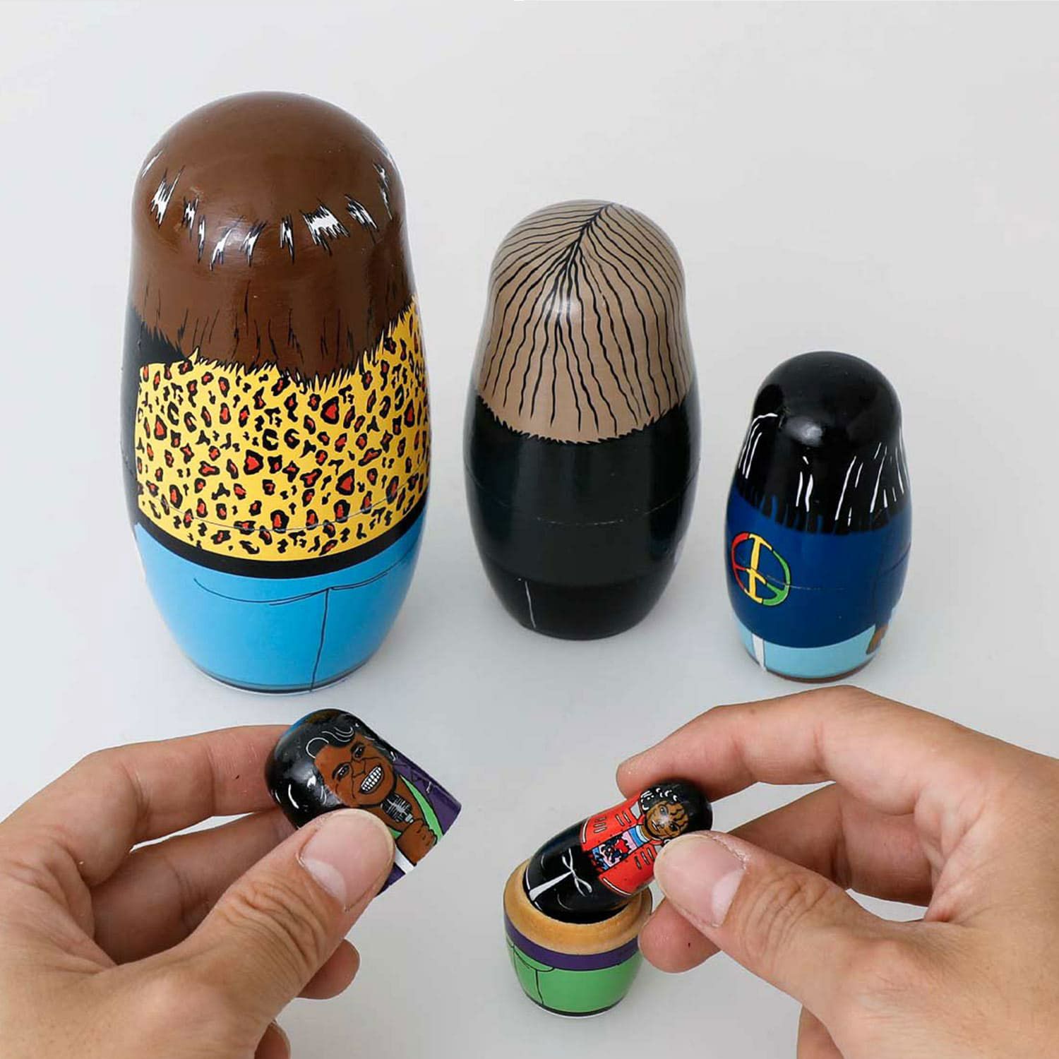 各時代の音楽シーンを引っ張ってきたあのスターたちがマトリョーシカに。アーティストをモチーフにしたマトリョーシカは数多くありますが、このイラストの絶妙なリアルさ加減となんとも言えない表情に惹かれます。イラストレーションを担当したのは、雑誌やアパレルブランドとのコラボなど幅広く活躍する人気イラストレーター MIDORI KOMATSUさん。ポップの中にタブーを注ぐ独特なイラストの魅力に誰もがメロメロです。