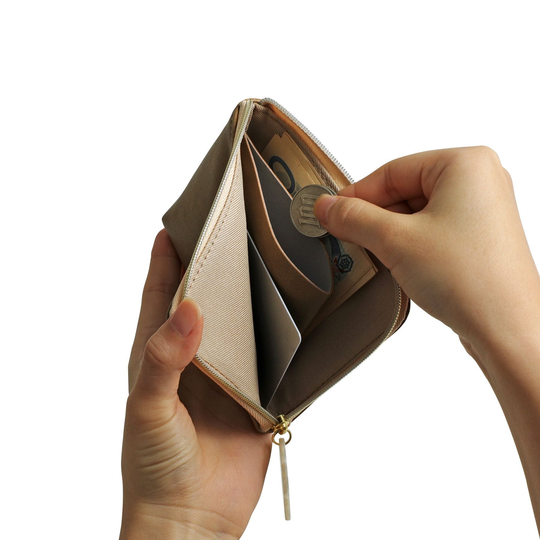 内側中央に仕切りポケットがあることで、小銭やお札、カードを分けて収納することができます。