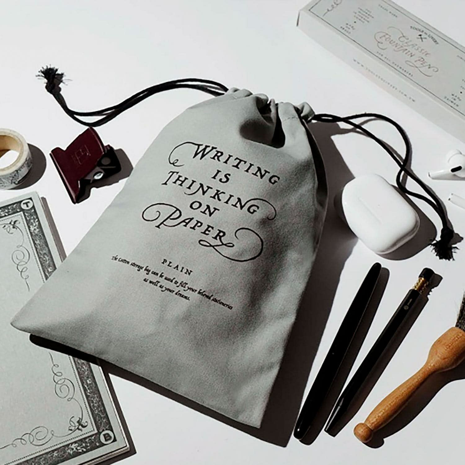 前面には「Writing is thinking on paper(書くことは紙の上で考えることである)」という文章がデザインされており、頭にあることを書き出して整理するブレインダンプという方法を連想させます。
