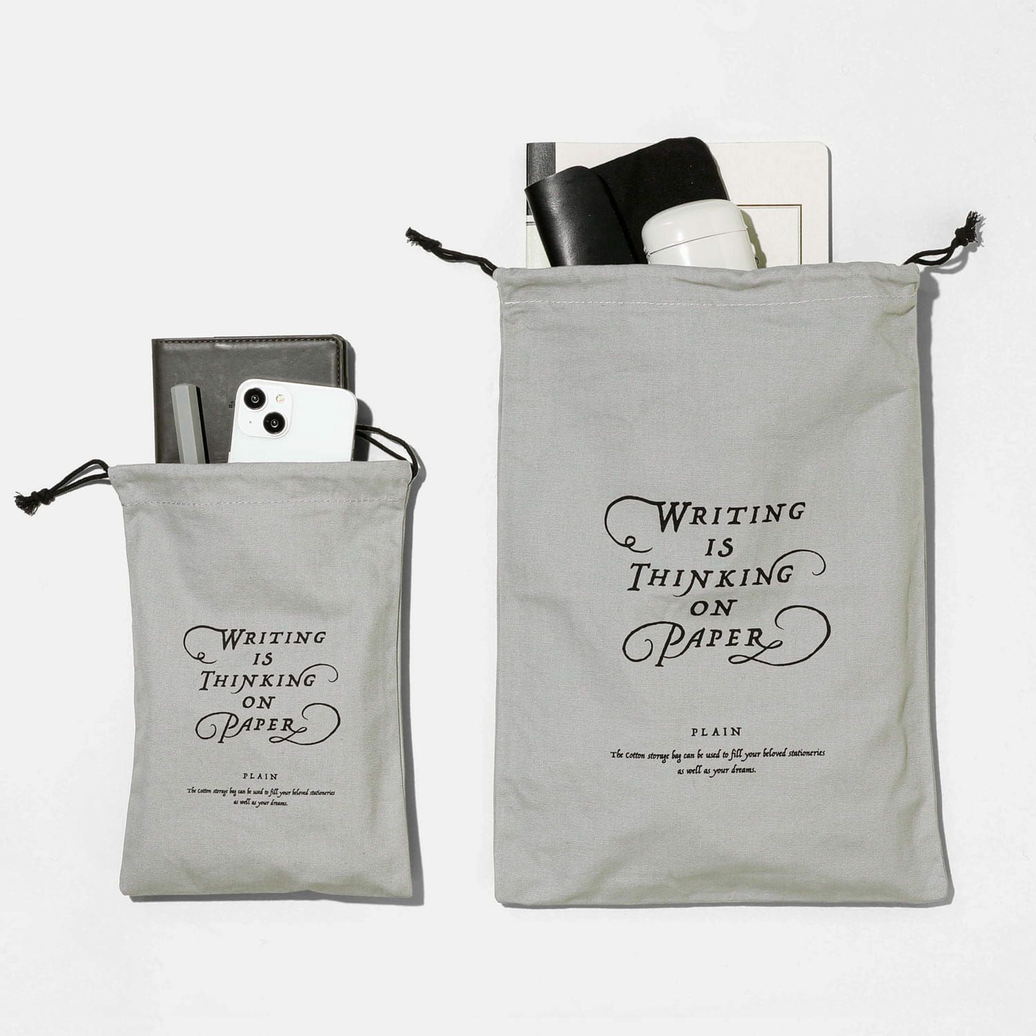 巾着ポーチとして小物などの整理に使えるSサイズと、スリッパや靴下を入れて旅行に便利なLサイズの2サイズ展開。