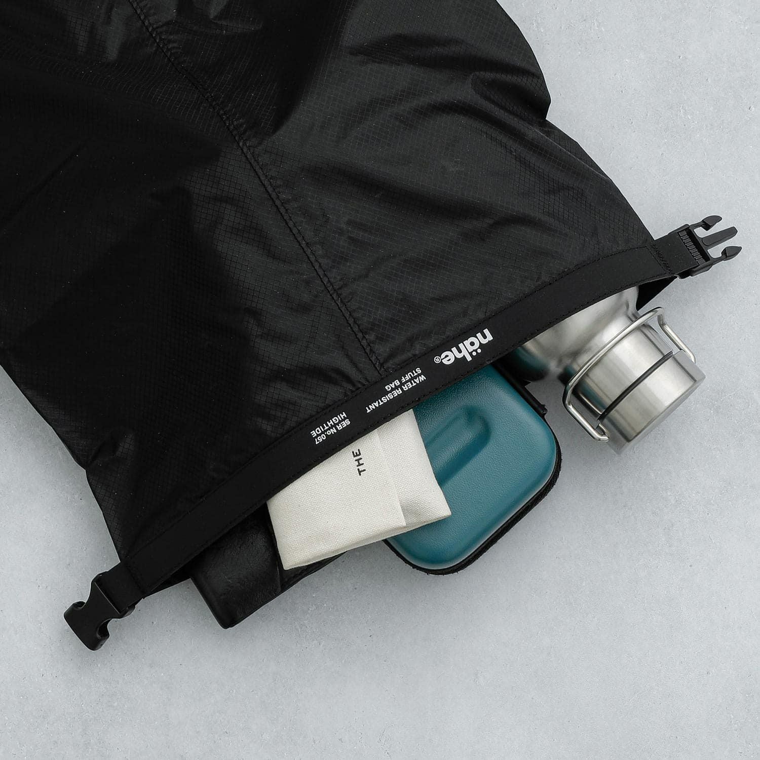 撥水加工を施したnähe(ネーエ)ドライバッグ。本格的なアウトドア用品にも多く使われる「高密度リップストップナイロン」を使用し、薄くて超軽量でありながら、頑丈で耐久性に優れているのが特徴です。アウトドアはもちろん、旅行時の衣類や、靴・スリッパなどを収納するのに便利。ステッチ部分にはシームテープを貼っており、生地の継ぎ目から浸水を防ぐのでジムやサウナでも活躍します。上部をねじってバックルで留めると持ち手になる、汎用性の高い収納バッグです。2つのサイズをご用意していますので、用途に合わせてお選びください。