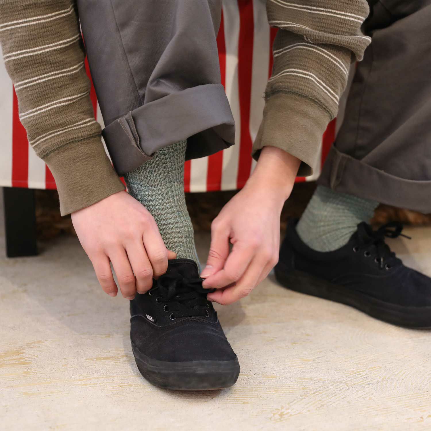 凹凸で表情のあるワッフル編みが特徴。ブラック、ネイビー、ベージュのベーシックな3色と、足元のアクセントとして取り入れたいミントをご用意しています。
