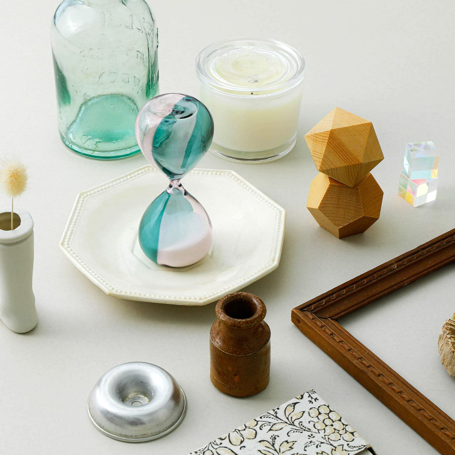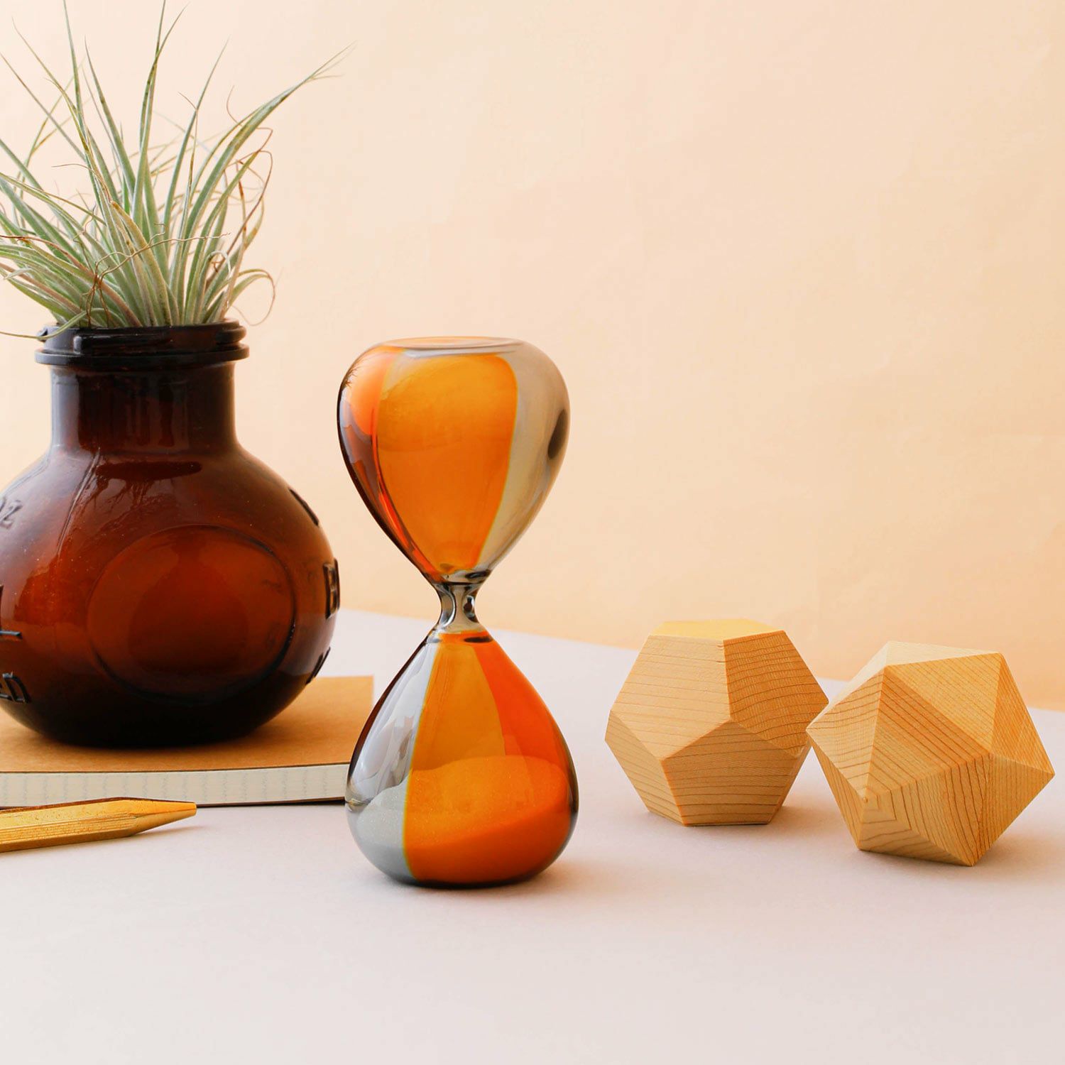 バイカラーの色ガラスが美しい砂時計。職人による手しごとのため個体差があり、ガラスの表情もそれぞれ異なります。見る角度や向きによって色の重なりも楽しめる逸品です。書斎の本棚や窓際のスペースなど、ちょっと飾っておくだけでも存在感があります。流れ落ちる砂を眺めながらゆったりとした時間をお楽しみください。
