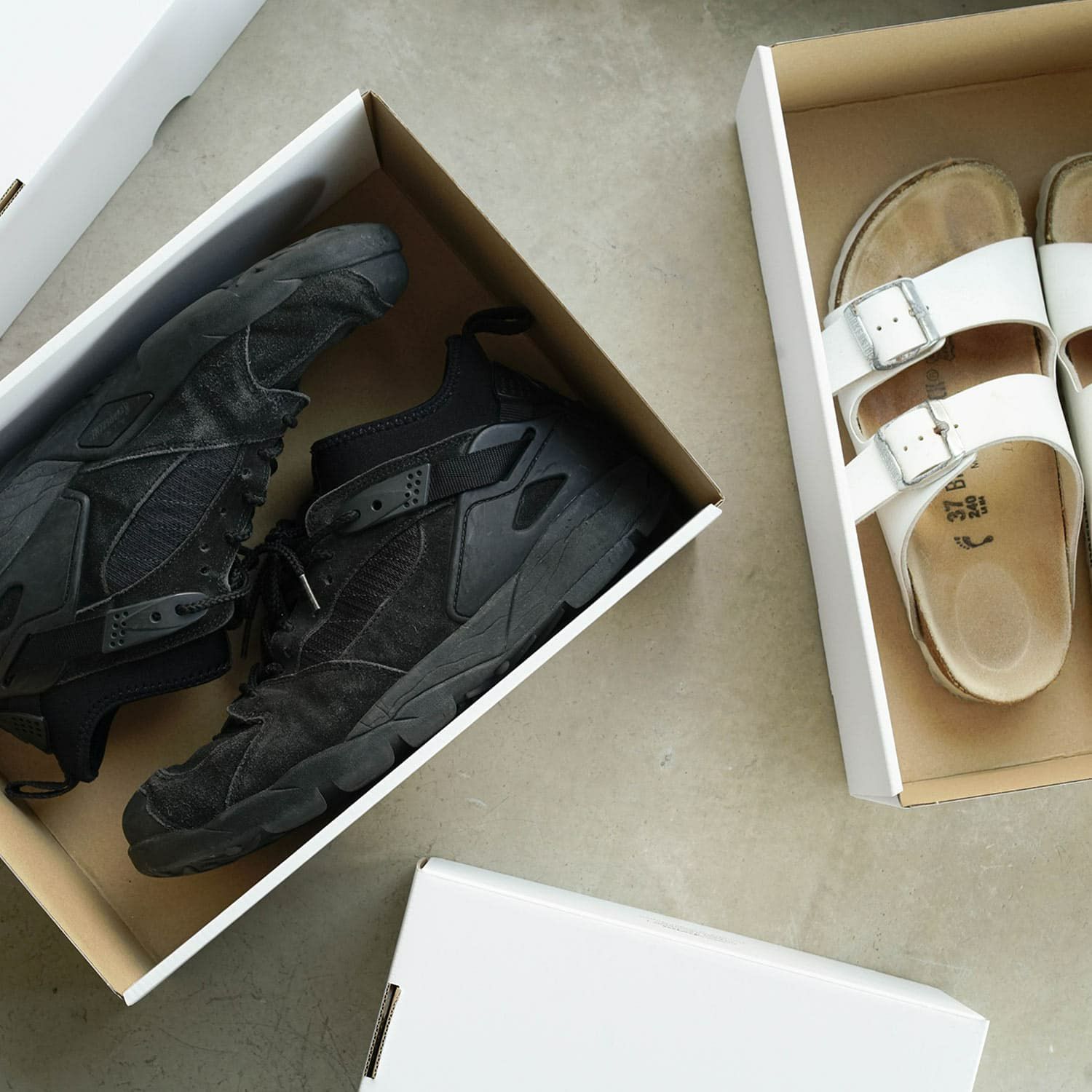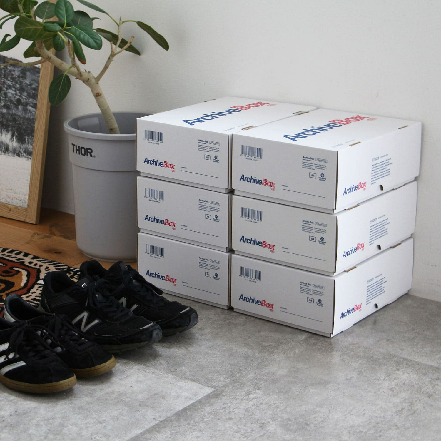 スニーカーもピッタリ入るサイズ。ブランドによって大きさやデザインの違うスニーカーの箱も、入れ替えて積み上げておけば、見た目にも統一したすっきりとした収納に。