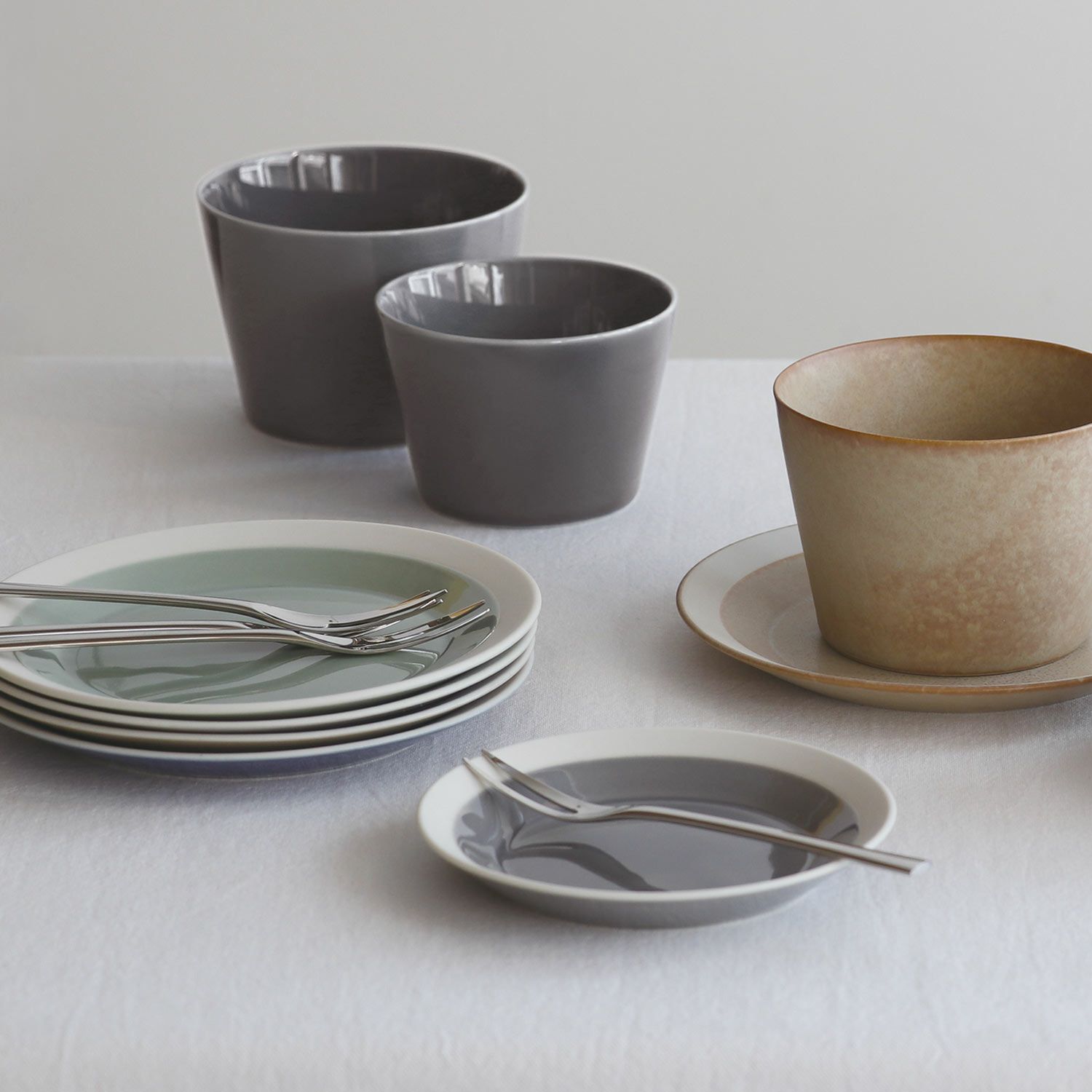 ニュアンスカラーが美しい色展開。sand beigeとmoss grayは光沢のないマットな質感、その他の色はツヤのある釉薬になり、つるつるとした表情です。
