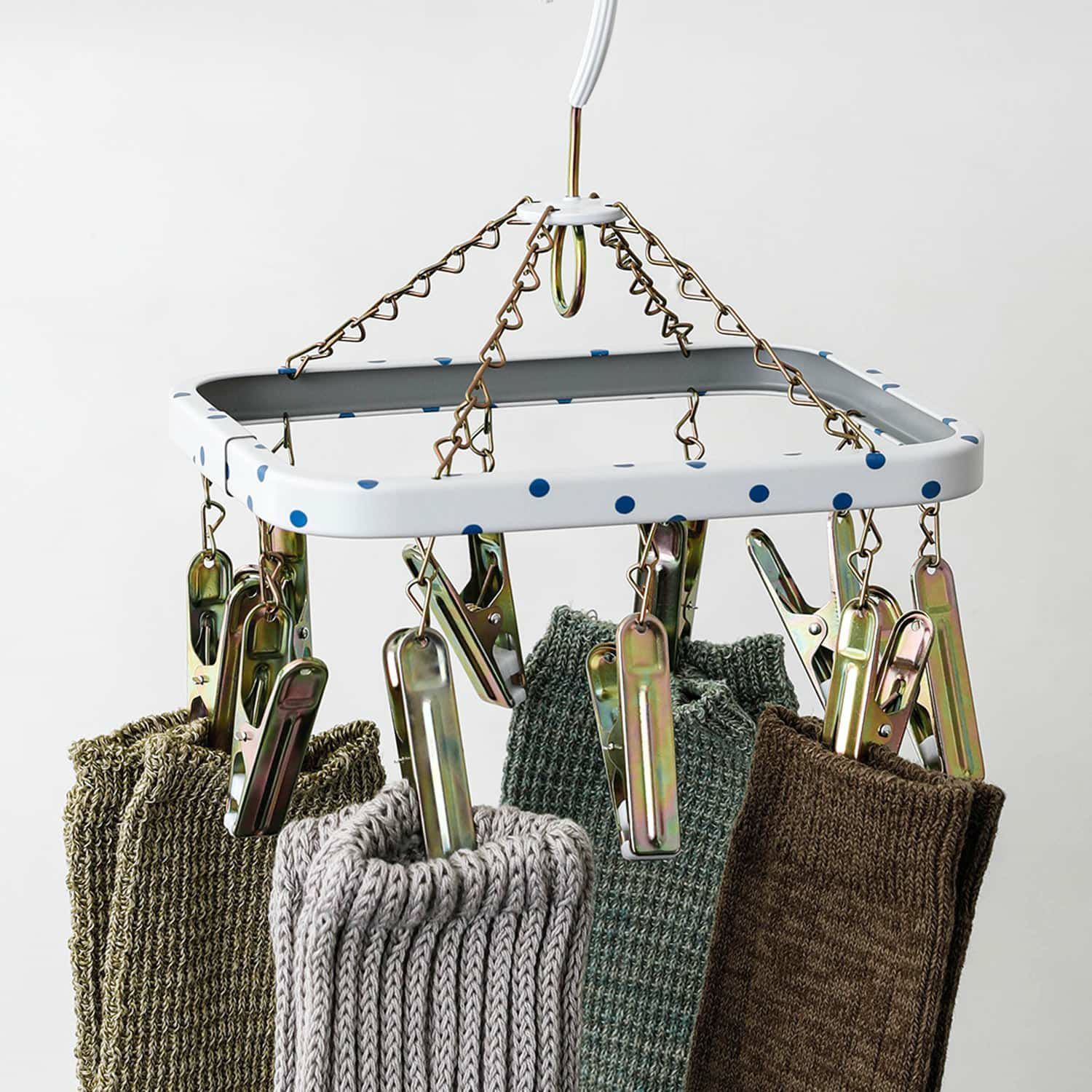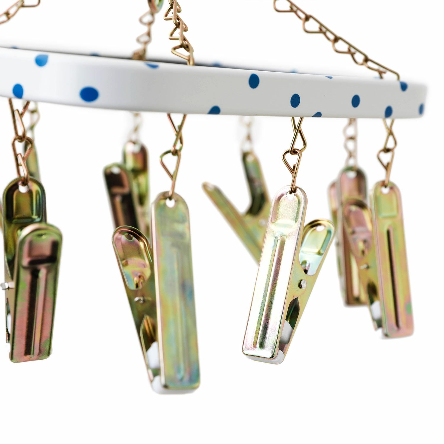 爽やかな白地に映える可愛らしい水玉とスチールピンチ、細くて丈夫なフックがレトロな雰囲気です。