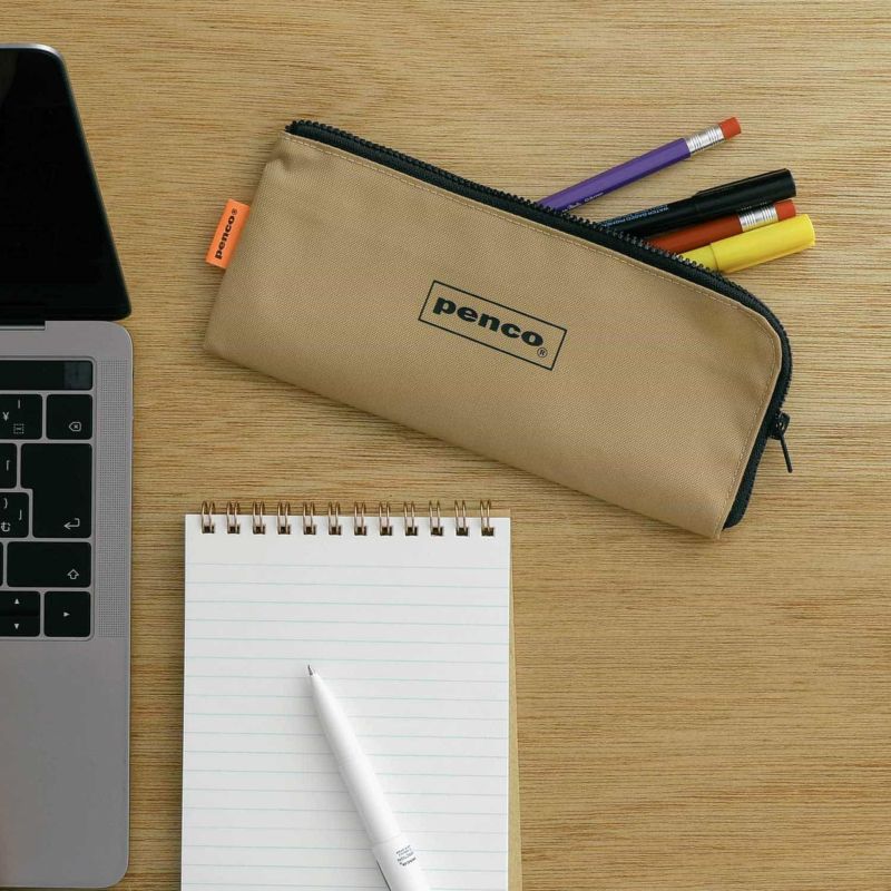 カジュアルな雰囲気が魅力のpencoのフラットペンケースです。間口が広く、ハサミや定規も取り出しやすいL字ファスナー仕様。また、内側に2つポケットが付いており、細々したものの整理がしやすいのもポイント。筆記具だけでなく、様々な用途でお使いいただける使い勝手の良いアイテムです。