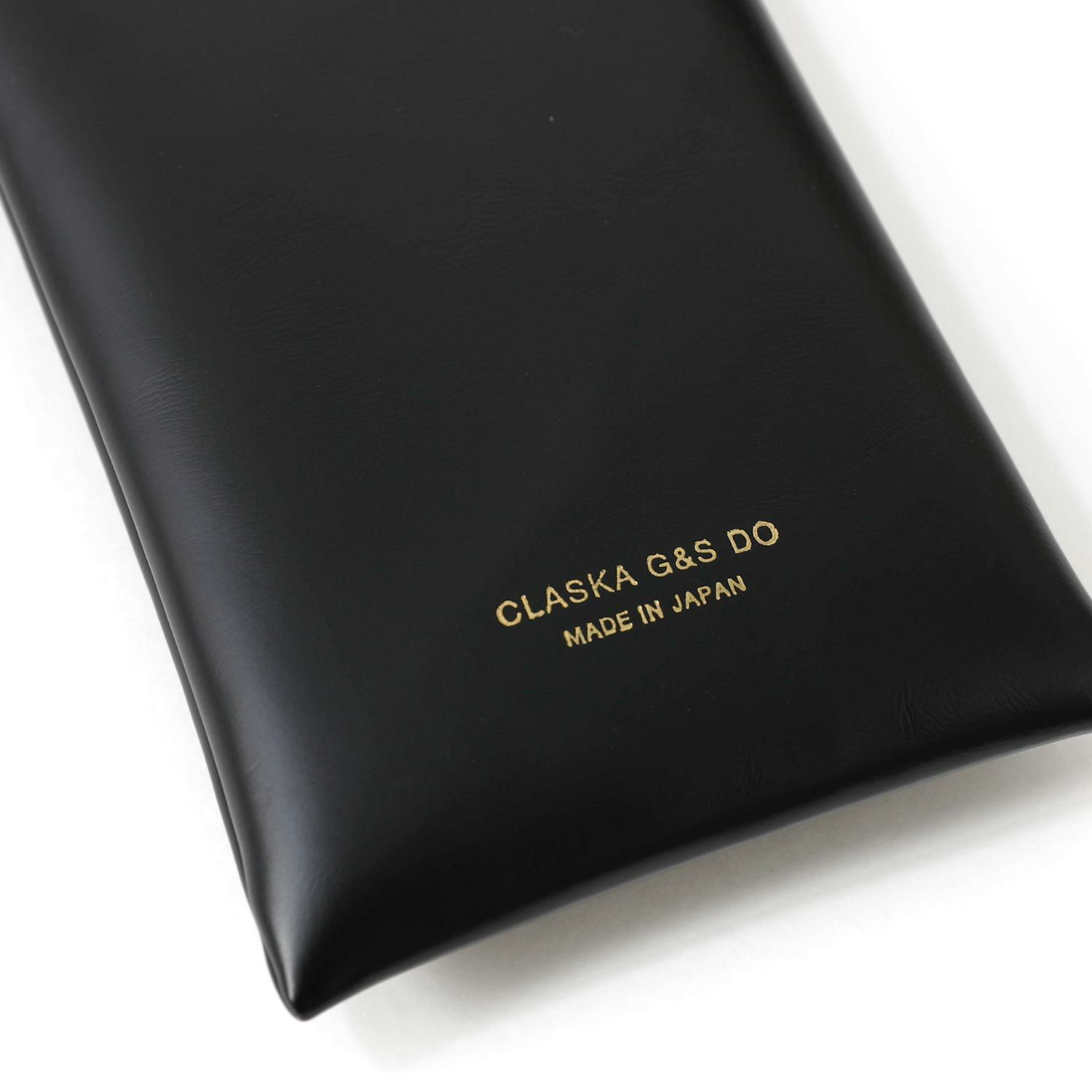 CLASKA Gallery & Shop "DO" オリジナル「BANK」シリーズのフラットポーチです。口はバネ式で、片手でパクッと簡単に開閉できます。艶のある合成皮革にゴールドの金具や箔押しを施し、シンプルでありながらクラシカルな雰囲気に仕上がっています。2サイズご用意していますので、用途に合わせてお選びくださいね。