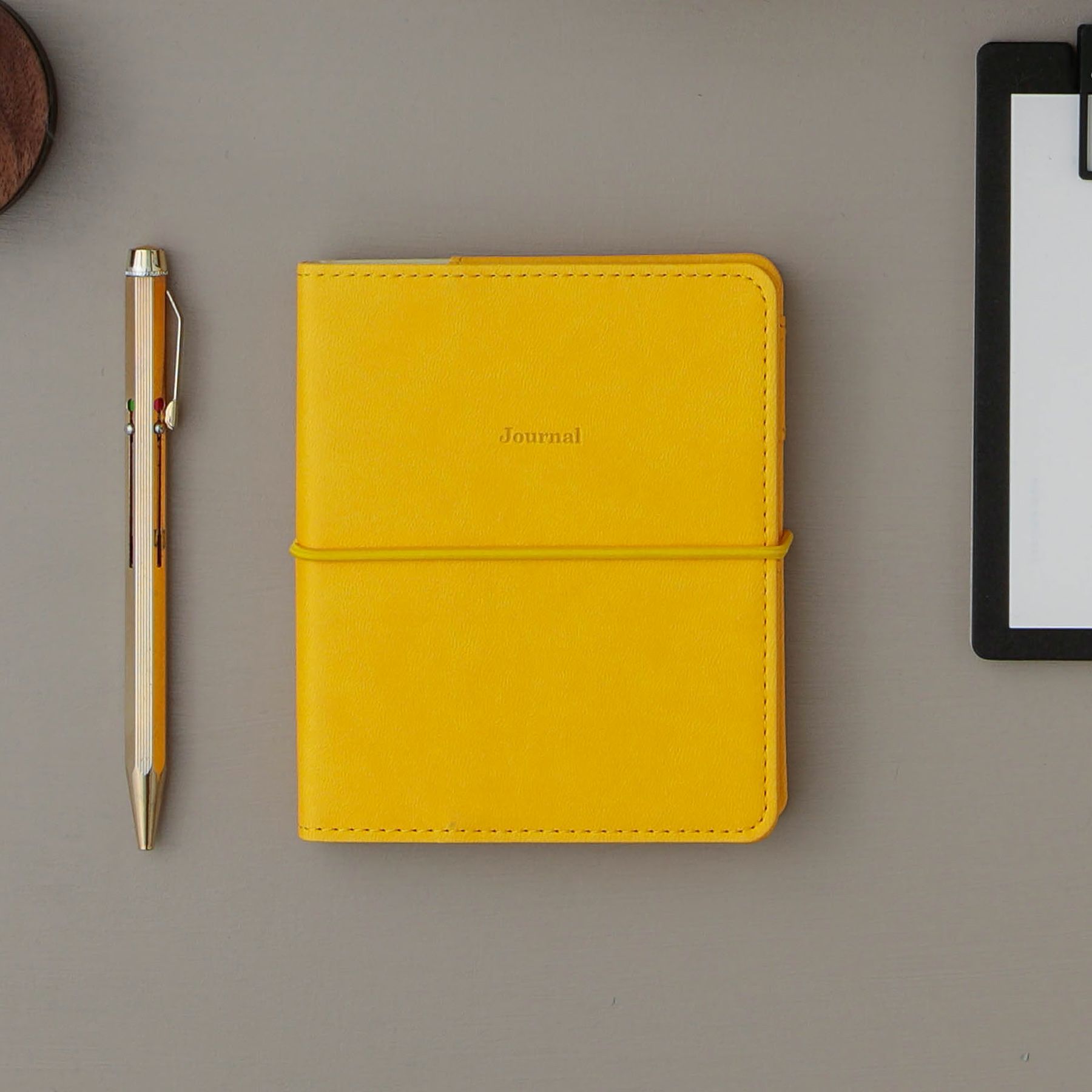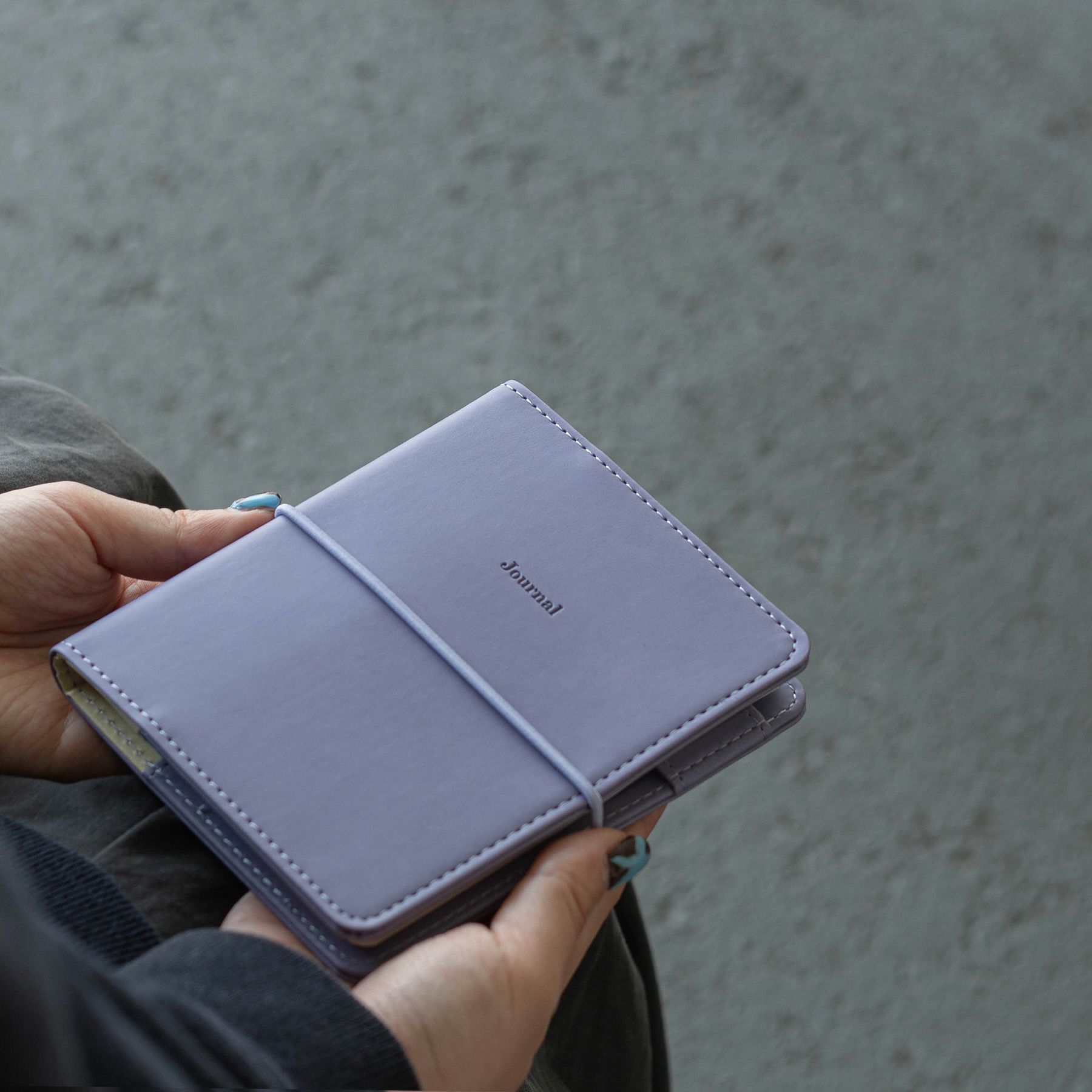なめらかなPU生地を使ったレプレ。丸ゴムで機能性とアクセントを加えました。しっとりした質感はもちろん、エンボス(凹凸)を付けたワンポイントもこだわりです。裏地は生地を合わせて強度も上げています。ゴムバンドが付いているので、かばんの中で中紙が折れたり、挟んでいる付箋やメモが飛び出る心配もありません。