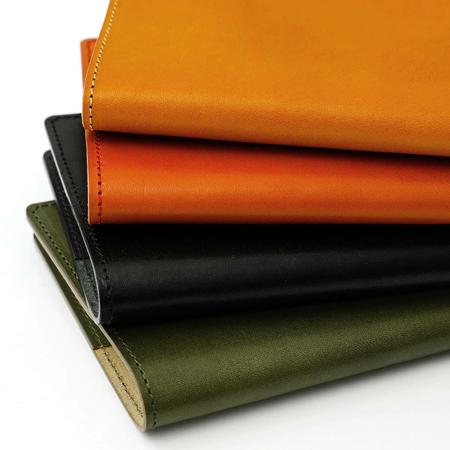 革の手帳カバーというと、まずビジネス手帳が思い浮かぶ方も多いかと思いますが、今回はファッション感覚でカジュアルにも持っていただけるような4色を選びました。ステッチの色はライトブラウンのみ生成りで、その他3色はカバーと同色に合わせています。
