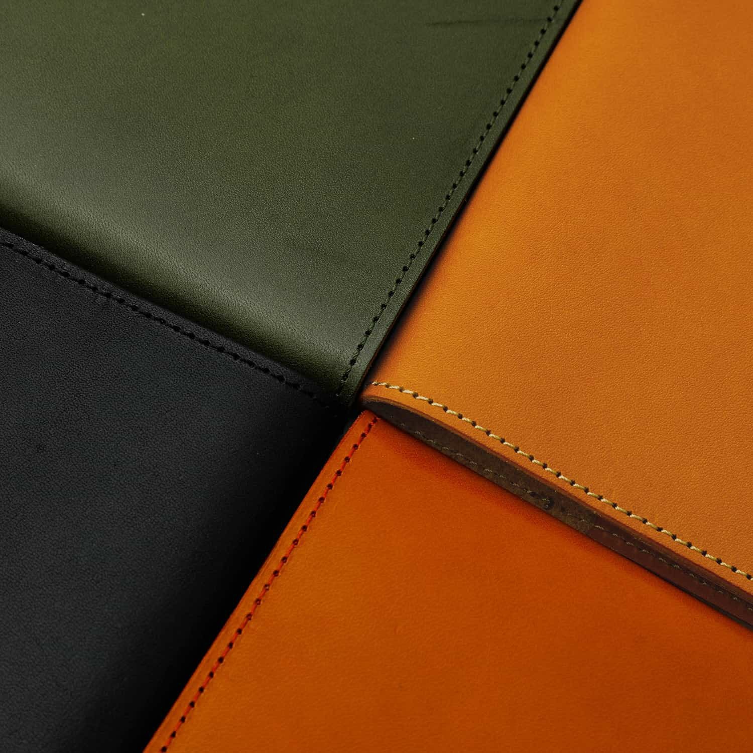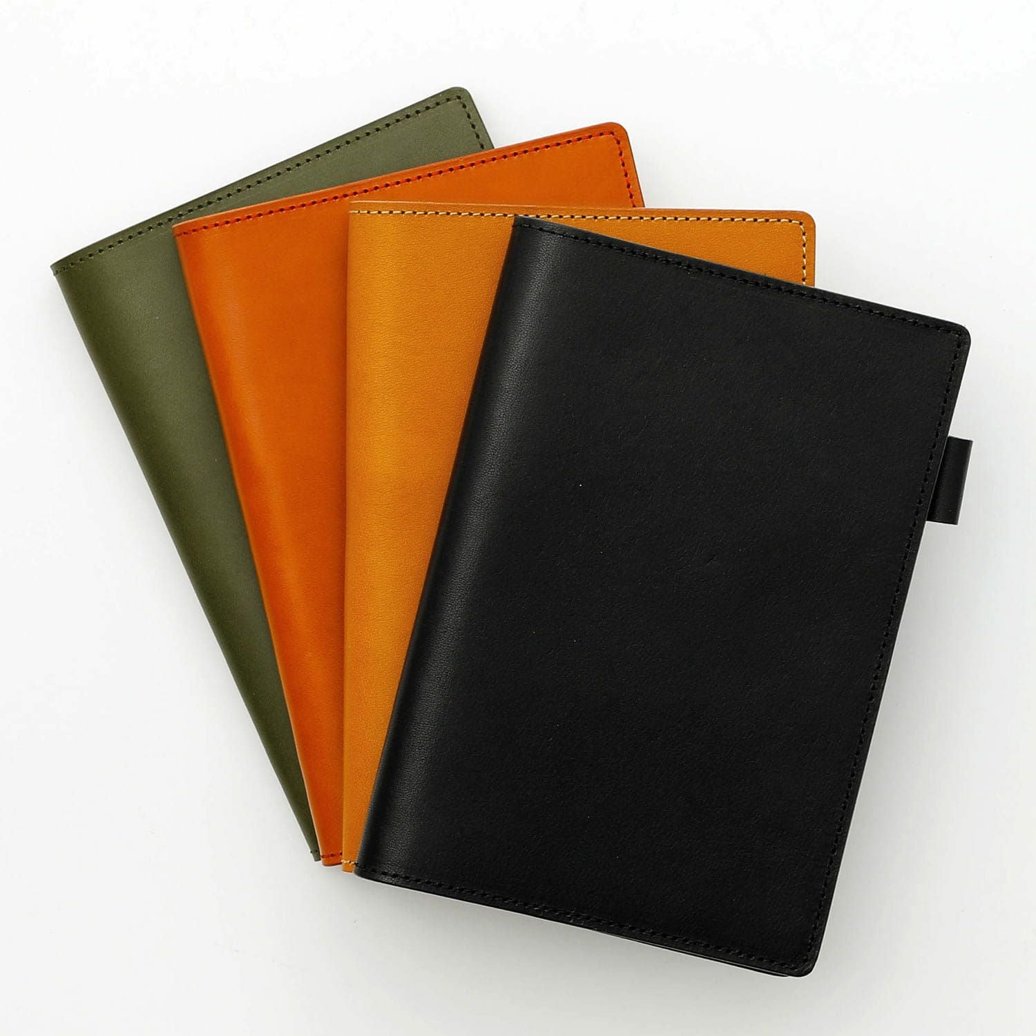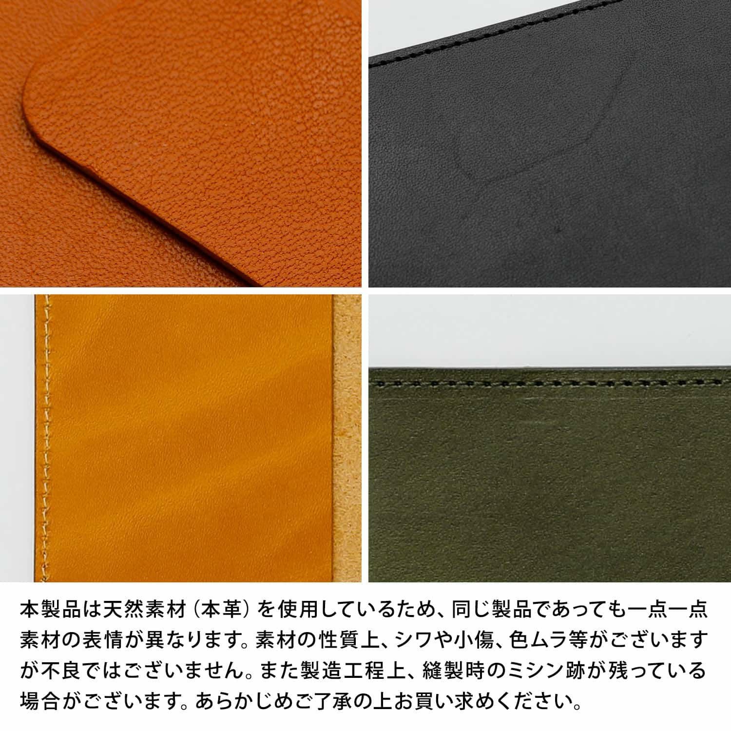 革の手帳カバーというと、まずビジネス手帳が思い浮かぶ方も多いかと思いますが、今回はファッション感覚でカジュアルにも持っていただけるような4色を選びました。ステッチの色はライトブラウンのみ生成りで、その他3色はカバーと同色に合わせています。