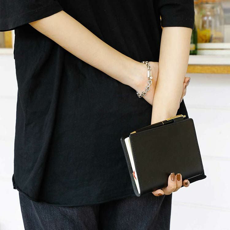 ペンキャッチャーのサイズが調整できるので、万年筆や4色ボールペンでも、太さを気にせずお使いいただけます。逆にスリムなペンの場合は、キュッと引っ張るとスッキリした印象に。手帳と一緒にお気に入りのペンを使いたいという方には嬉しいポイントです。