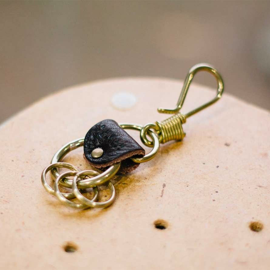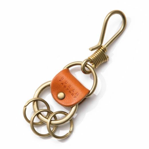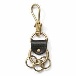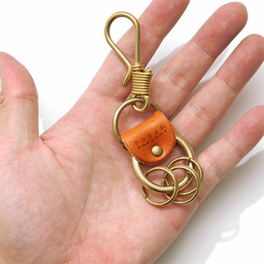 革を多用せず金属のシャープな印象を引き立てたキーホルダーです。ベルトループはもちろん、バッグの内ポケットに引っかけるなど、フックの特性により携帯しやくなっています。キーリングは3つで、真鍮同士が触れ合うとシャランといい金属音がなります。染料オイル仕上げの革はしっとりとした風合いが特徴。使い込む程に手に馴染みエイジングも楽しめます。