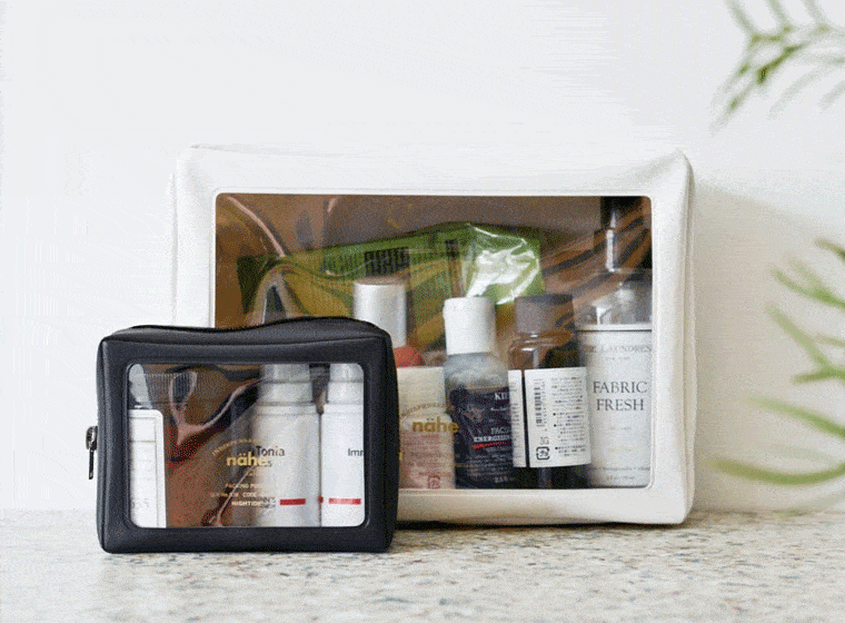 化粧品やスキンケアグッズは汚れに強いPVC素材のポーチに。透明窓で中身が見えるので用途別に分けて収納しています。