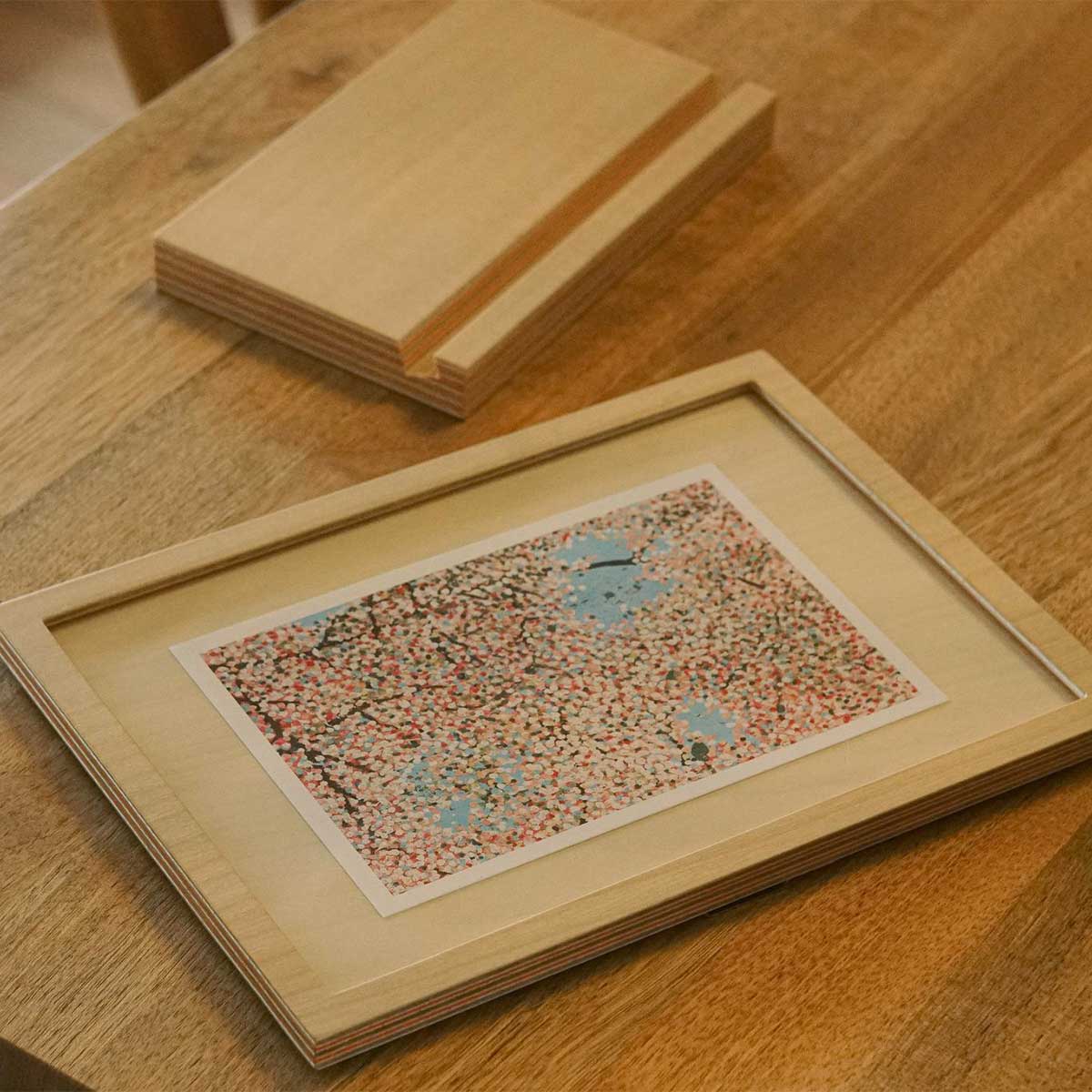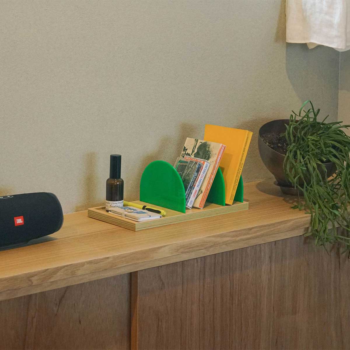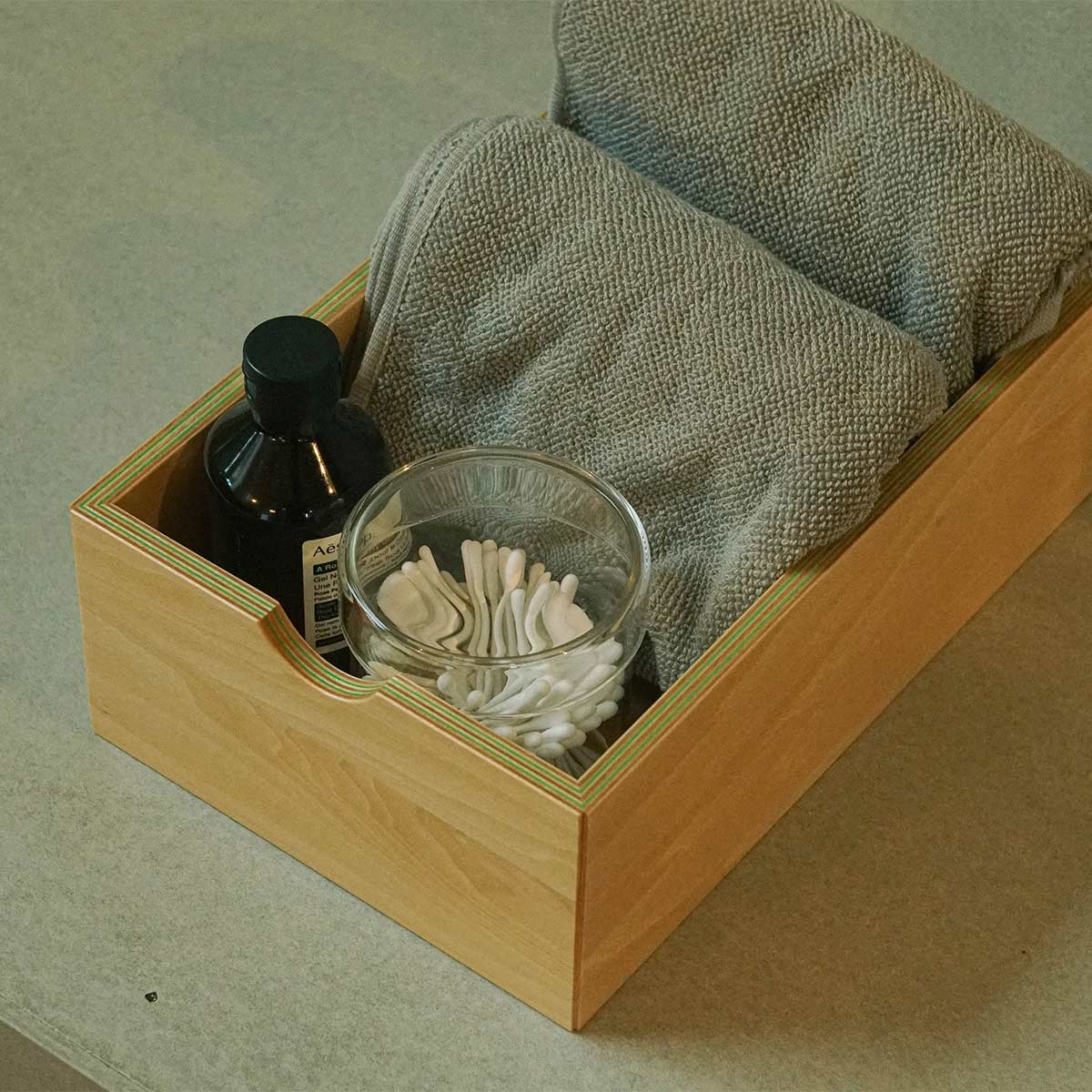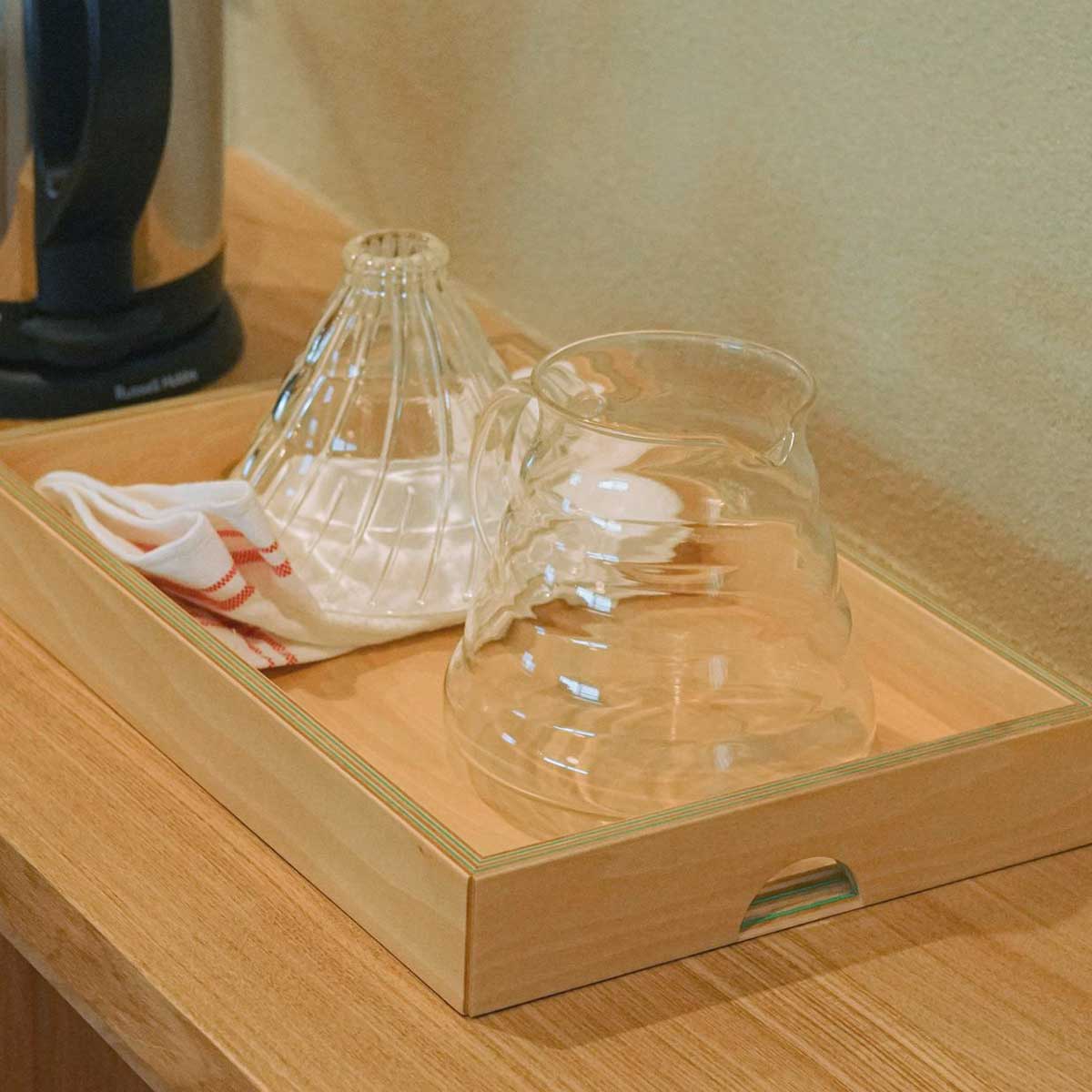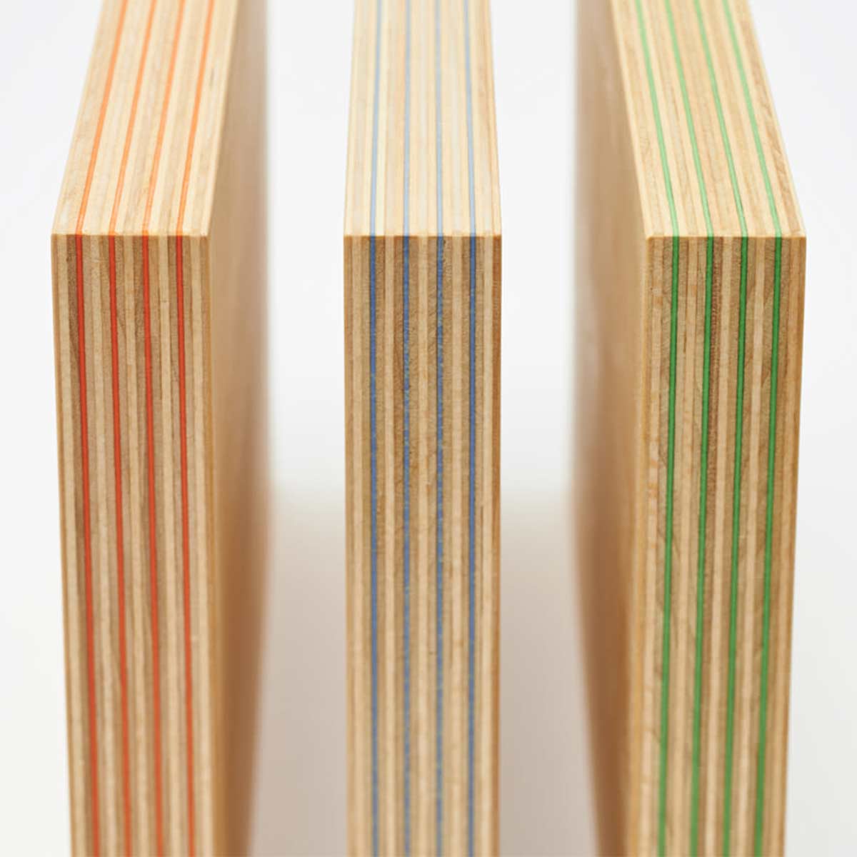 日本有数の合板工場で、国産シナ板と色紙を一枚ずつ貼り合わせた、美しい木口が特徴の積層合板です。どこでカットしても同じようにストライプが現れます。有機的な木材に無機物のアクリルを加えることでモダンさを出しています。