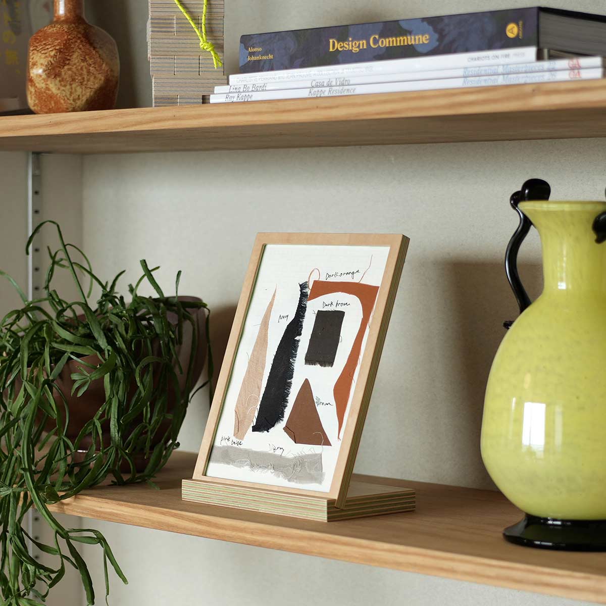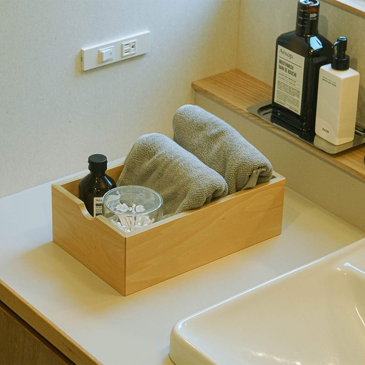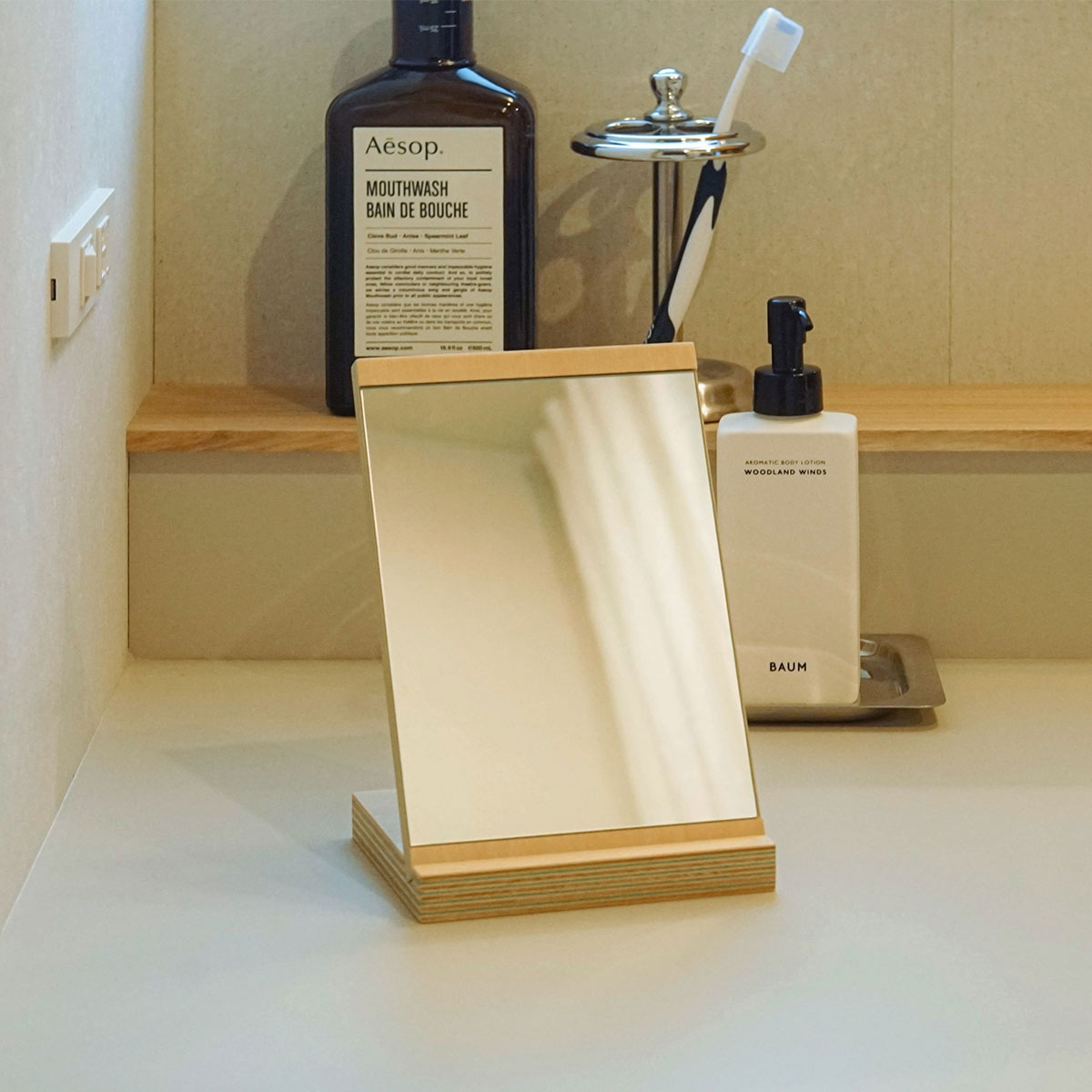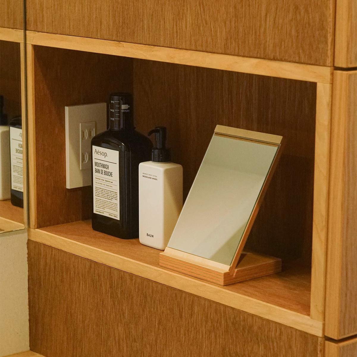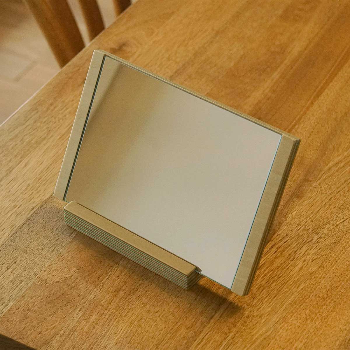 日本有数の合板工場で、国産シナ板と色紙を一枚ずつ貼り合わせた、美しい木口が特徴の積層合板です。どこでカットしても同じようにストライプが現れます。有機的な木材に無機物のアクリルを加えることでモダンさを出しています。