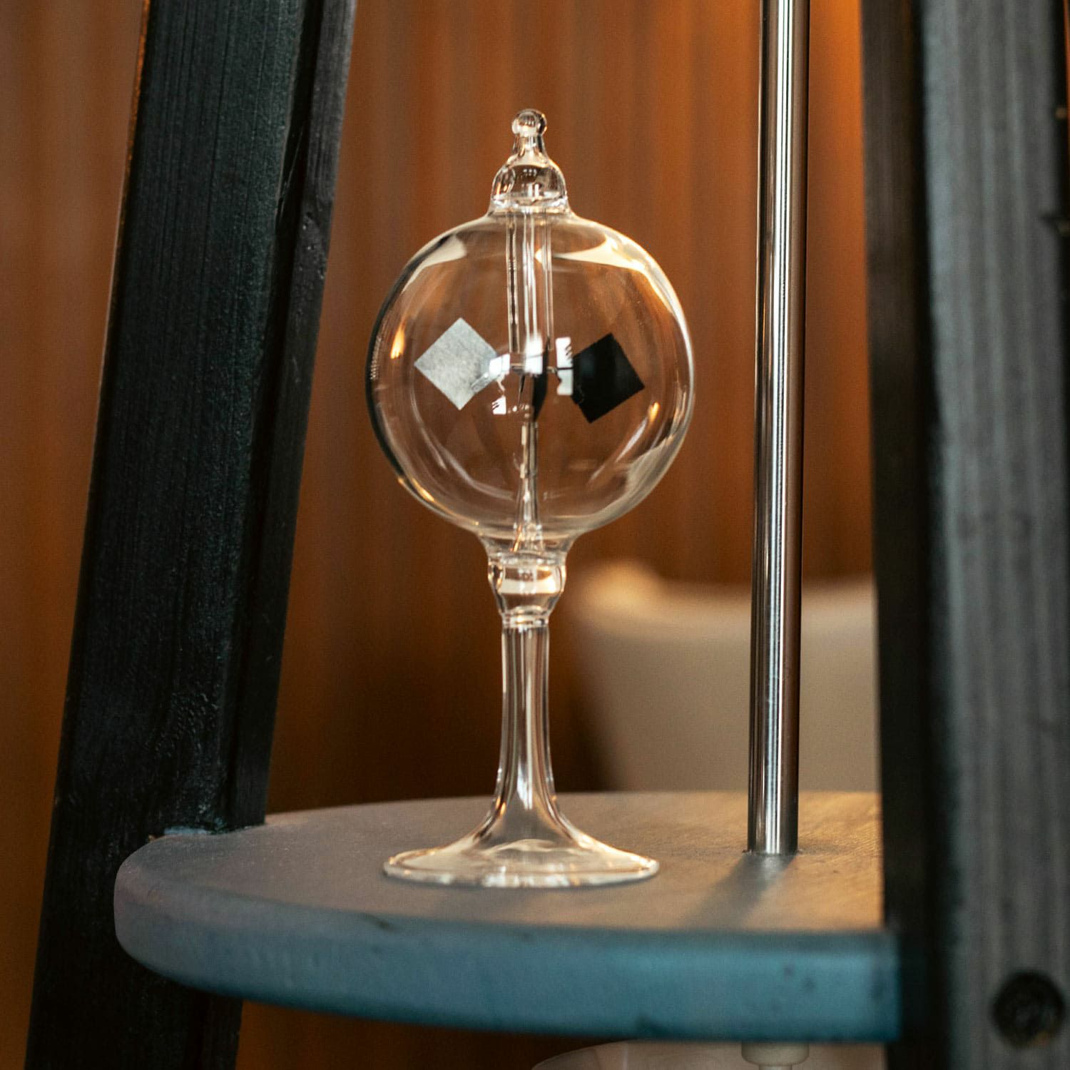 ガラス内に羽の片面が黒い羽根車が収められたシンプルな構造ですが、その羽が赤外線を含む光に反応して回る不思議なオブジェです。実験器具でありながらも、その独特な美しい造形はインテリアアイテムとして高い人気を誇ります。