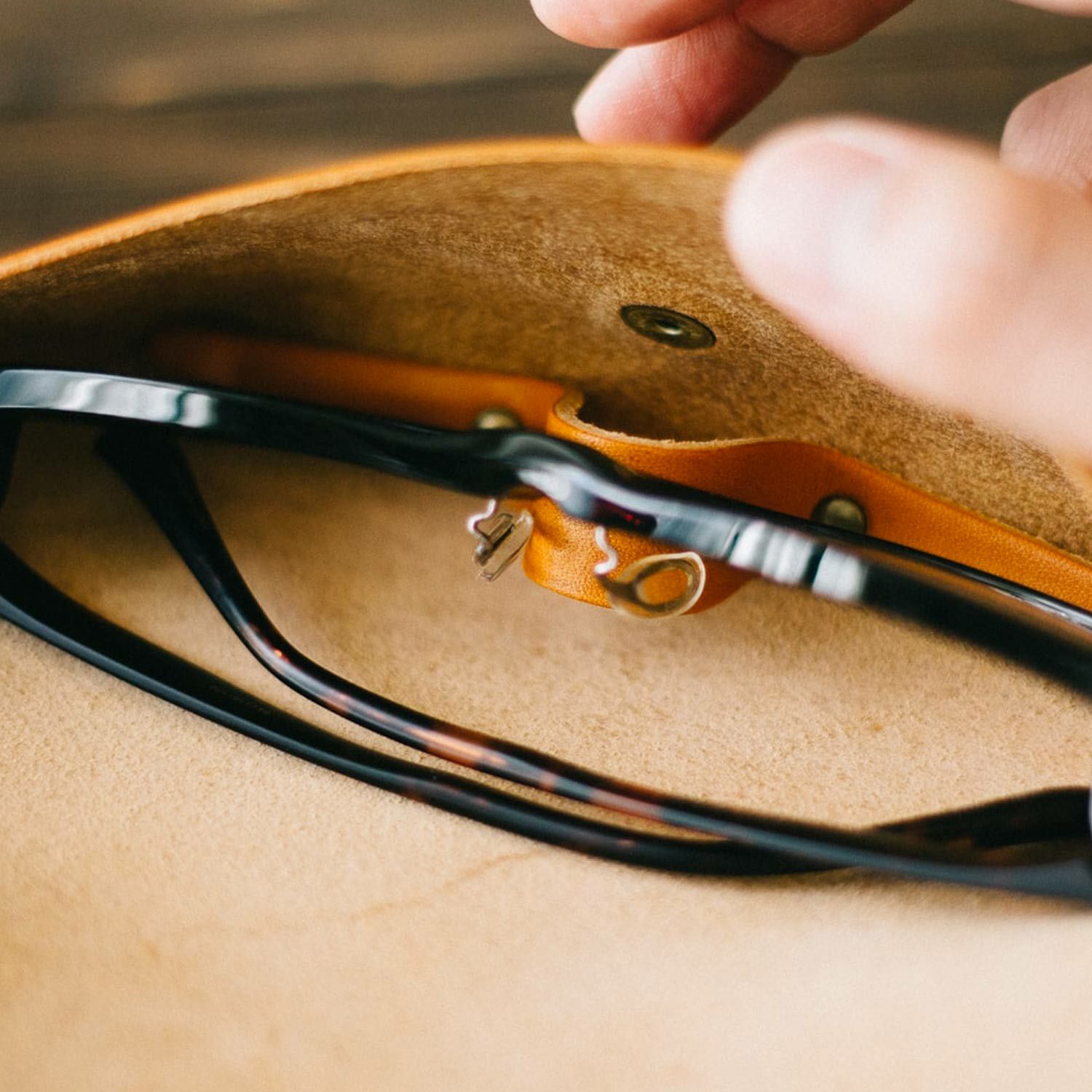 内部には持ち歩きの際にメガネが動かないように固定する鼻当てがあります。また、開閉時によく触れるホックの周辺は革で補強しています。日常的に使うものなのでストレス無く使えるように工夫しました。