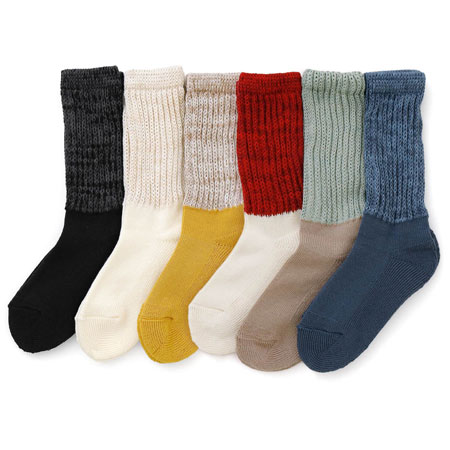 ゆったり履けるタオルのような風合いのローゲージソックス。ループ状の糸が連なって編まれた編み地で、やわらかな肌ざわりと優れた吸水性が特徴です。踵を大きく、分厚くすることでクッション性があり履き心地の良さも備えています。履き口ゴム部分はゆったり伸びる編み方で、締め付けを感じにくいリラックスした履き心地に。足首で切り替えたバイカラーが足元を楽しく彩ります。