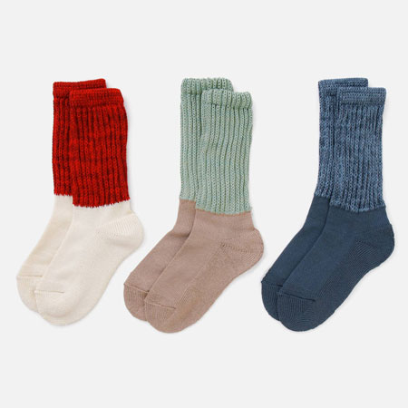 手編みのような風合いのローゲージソックス。履き口のトップ部分のみにゴム糸を入れているので締め付けもなく、くたっとしたシルエットが特徴です。ベーシックな色からポップな明るい色までが揃う無地の8色展開に、カレッジテイストなライン入りタイプの4色が新たに加わりました。ざっくりとした生地感が、スニーカーやスリッポンとの相性抜群です。