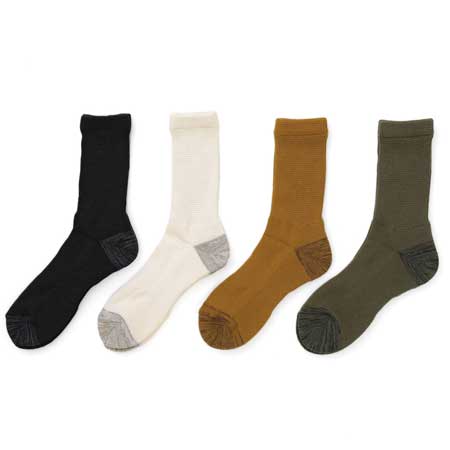 カラーは、ベーシックなホワイトとブラック、ミリタリーソックスの雰囲気をイメージしたブラウン、カーキの4色のラインナップ。ダークトーンが多くなる秋冬のコーディネートによく馴染みます。