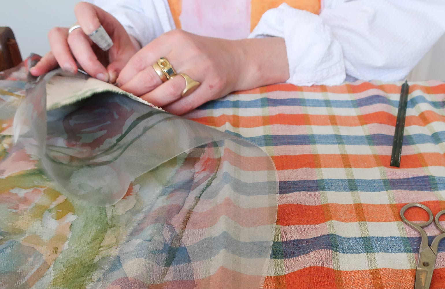 〈Picus〉の真鍮のプレートはインテリアであり、作業中に針を置く場所でもあります。片手で針を使う時に針山は少し不便ですが、このプレートは簡単に針を取り出せ、見つけやすいので便利です。以前はソファの上で針を無くし、そのまま上に座ってしまうこともありました。