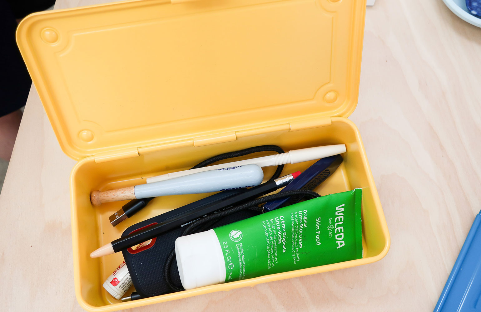 〈東洋スチール〉とHIGHTIDE USAのコラボのツールボックスは、鉛筆やペン、ノート、ローション、消しゴム、ハードドライブ、リップクリーム、お香など、日常的に使う道具を持ち運ぶのに使っています。