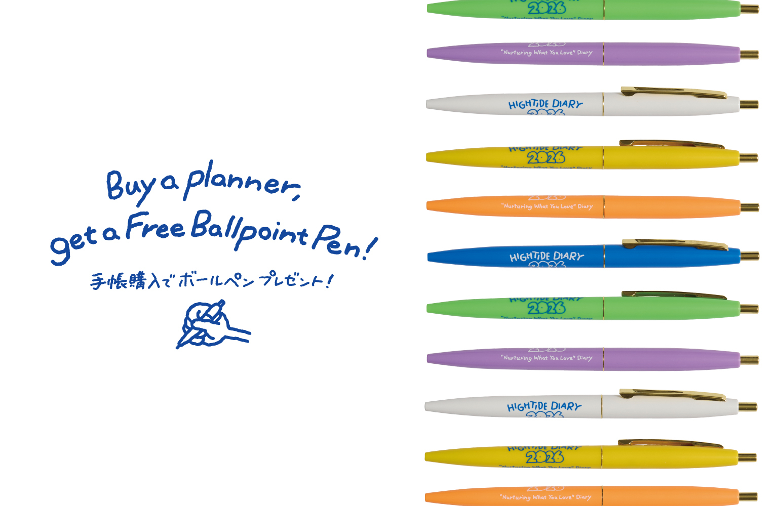 さらに2026年3月始まり手帳を含む、税込2,200円以上のご購入で、限定デザインのオリジナルボールペンもプレゼントいたします。全6色のポップなカラーバリエーションから、いずれか1本をランダムでお届けします。